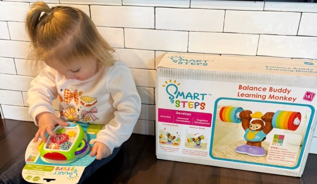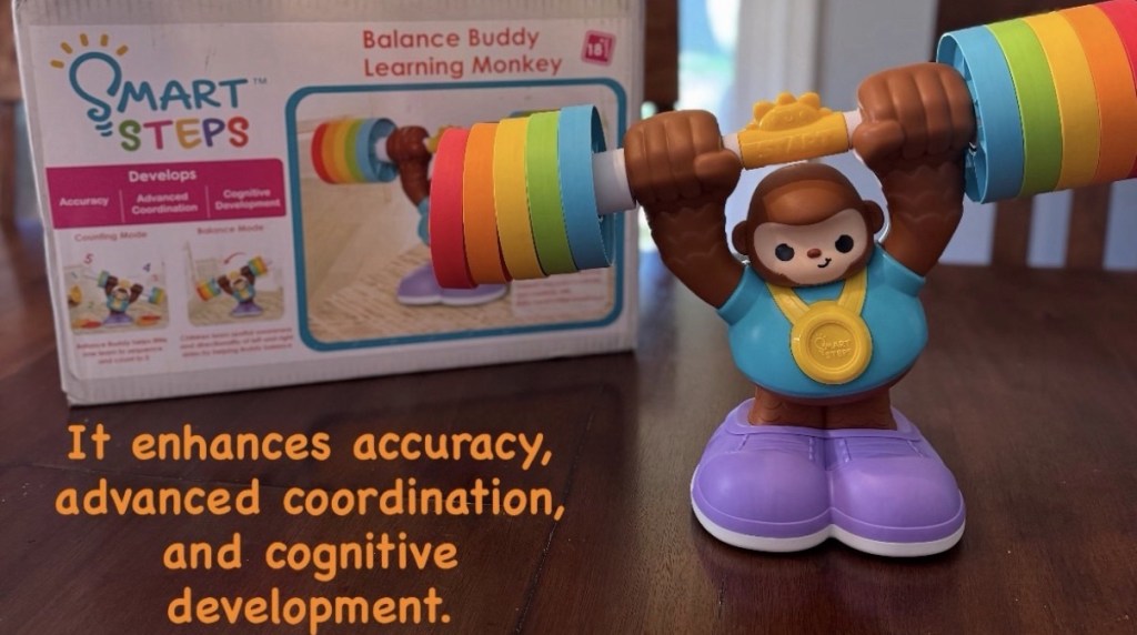 Smart Steps Balance Buddy Learning Monkey is for kids 18 months and up. It enhances accuracy, advanced coordination, and cognitive development. With two unique play modes-
