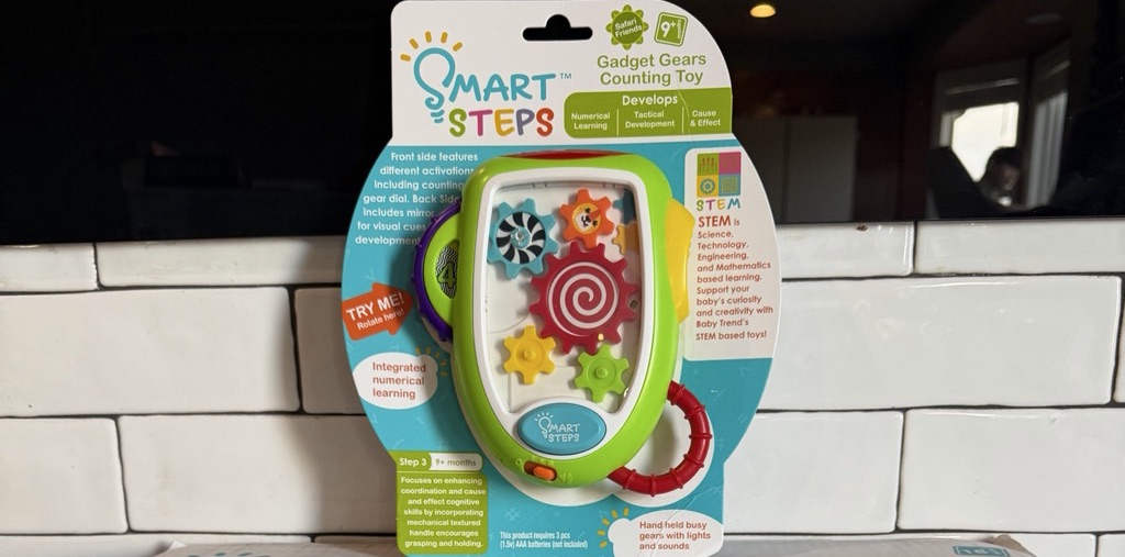 STEM-Based Learning: Gadget Gears help promote numerical learning, cause and effect and hand-eye coordination. Activity features on the front side include counting dial that turns gears, button, toggle switch and pull ring.
